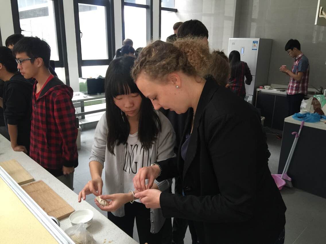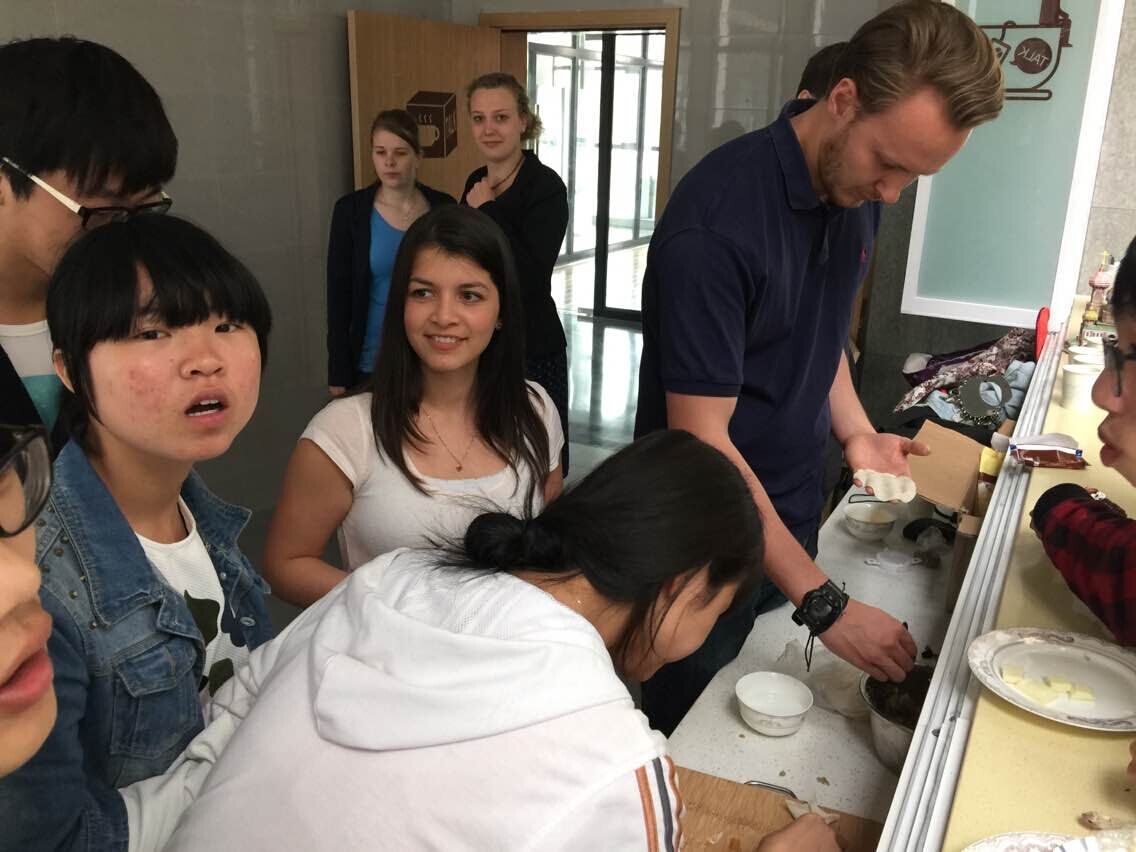 双方的讲解都结束后,同学们带着德国朋友一起包起了饺子,体会中国传统美食的制作魅力。除了饺子,同学们还制作了小蛋糕,果冻,香肠等,德国的朋友则带来了德国巧克力和大家分享。“美食”将整个交流氛围推向高潮。之后,大家围坐在一起,一边喝着自制的咖啡,一边聊着天。
