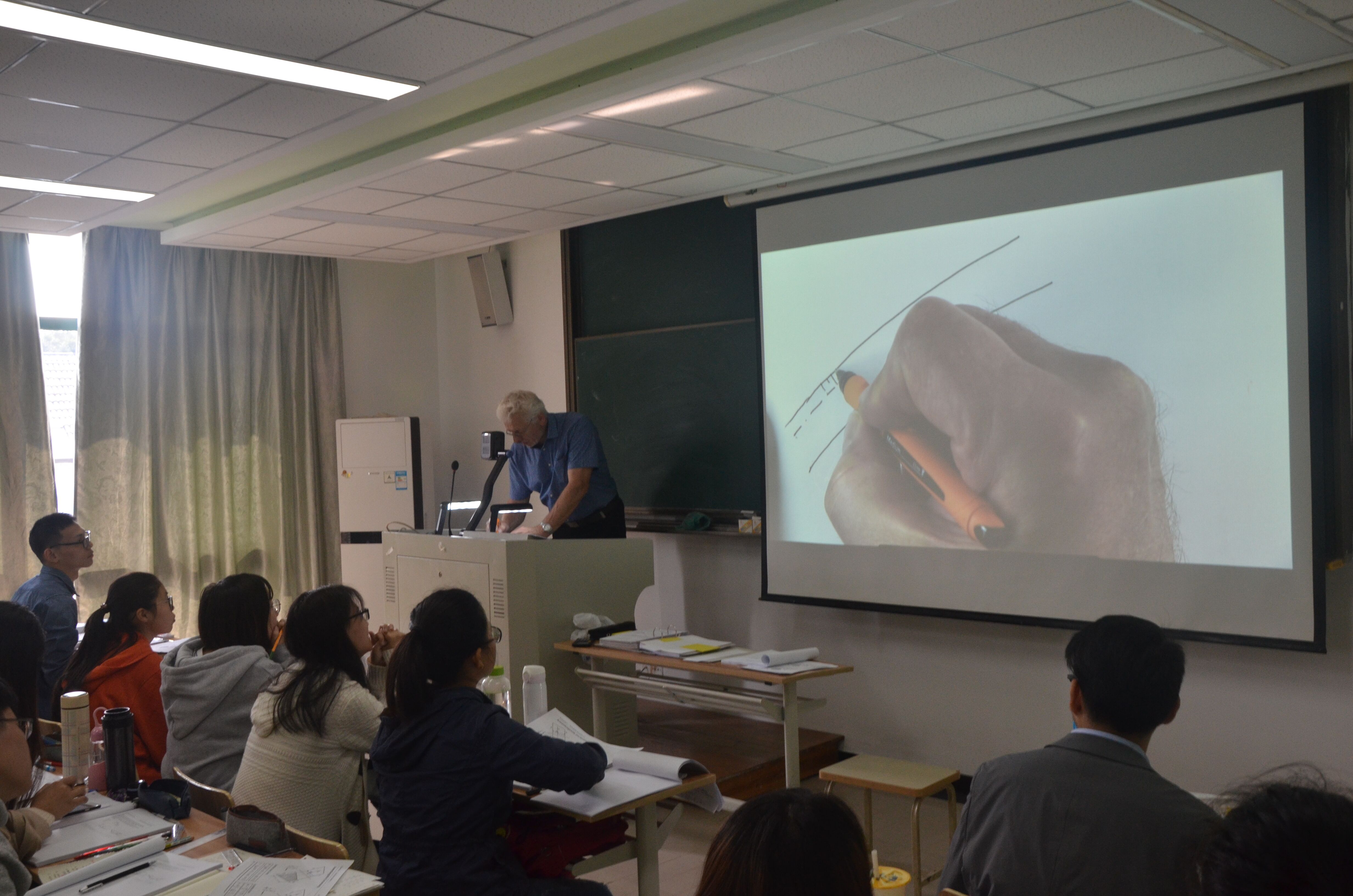 舒兹曼教授从德国带来了实物投影仪,采取边画图边讲课的形式,通过画图帮助学生更好地理解流体力学的相关知识,也减轻了学生们用德语接收这门课程的心理压力和实际的学习压力。