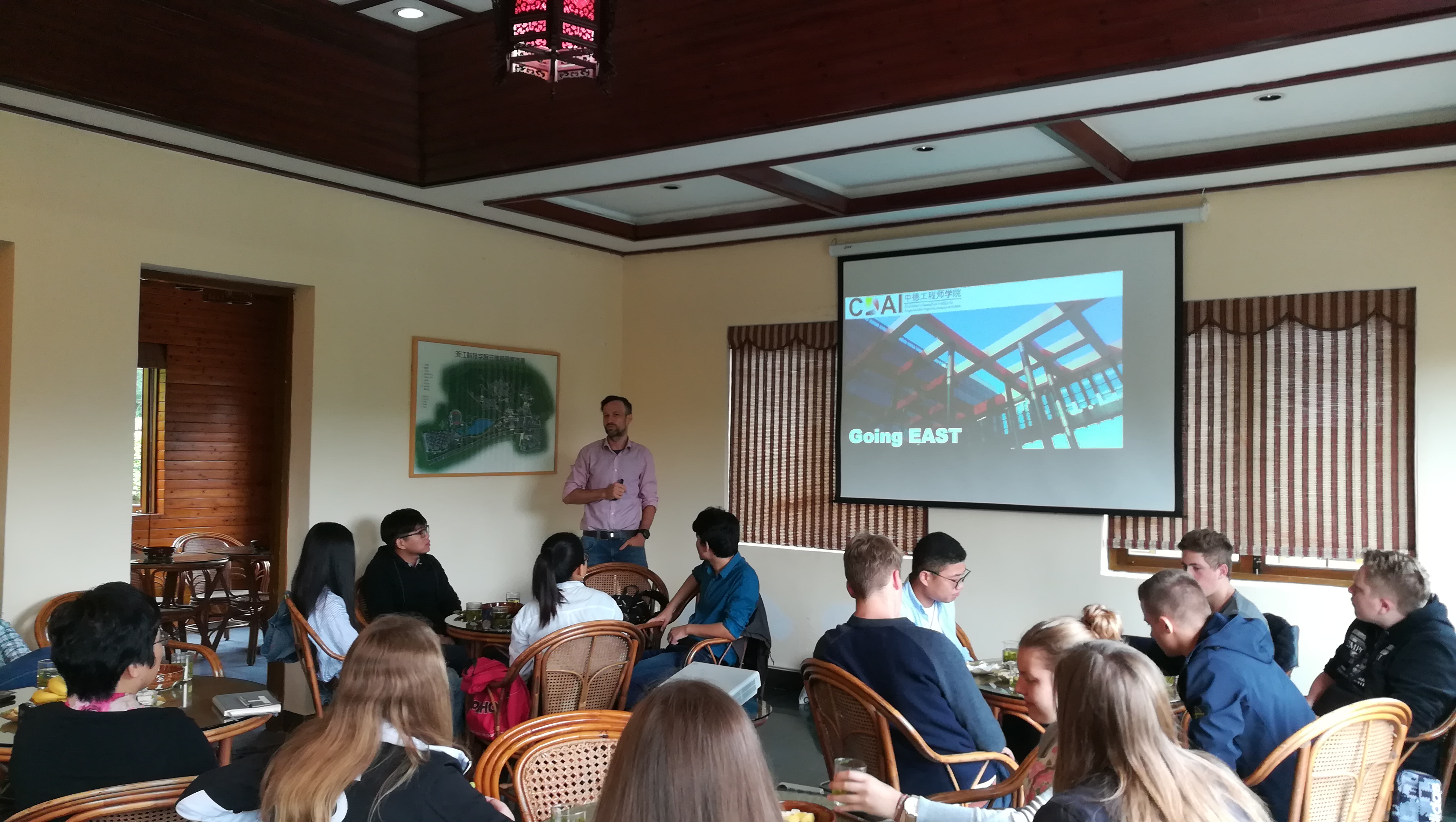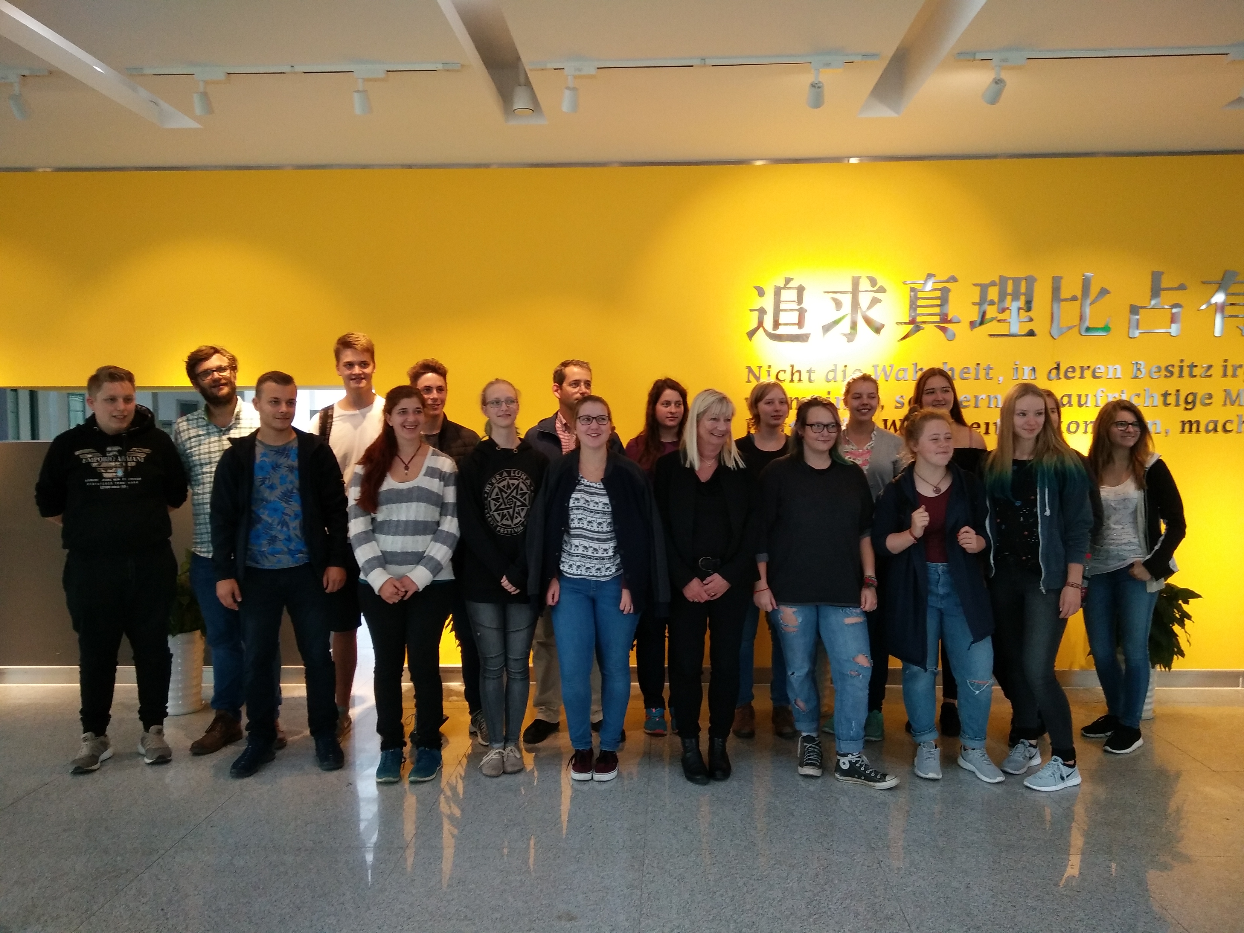 10月13日中午,在中方项目协调员安德鲁斯·哈姆斯(Andreas Harms)、迈克尔·斯达姆麦尔(Michael Stammeier)、部门主管芭芭拉·布克斯(Barbara Bucksch)的带领下,来自德国北部石荷州小城奥伊廷(Eutin)职业中学的学生代表团一行19人来快活影院 进行参观和访问,快活影院 院长徐理勤、教学院长弗兰克·坎伯(Frank Kemper)、党支部书记李成炜及相关教师参加了见面交流会。