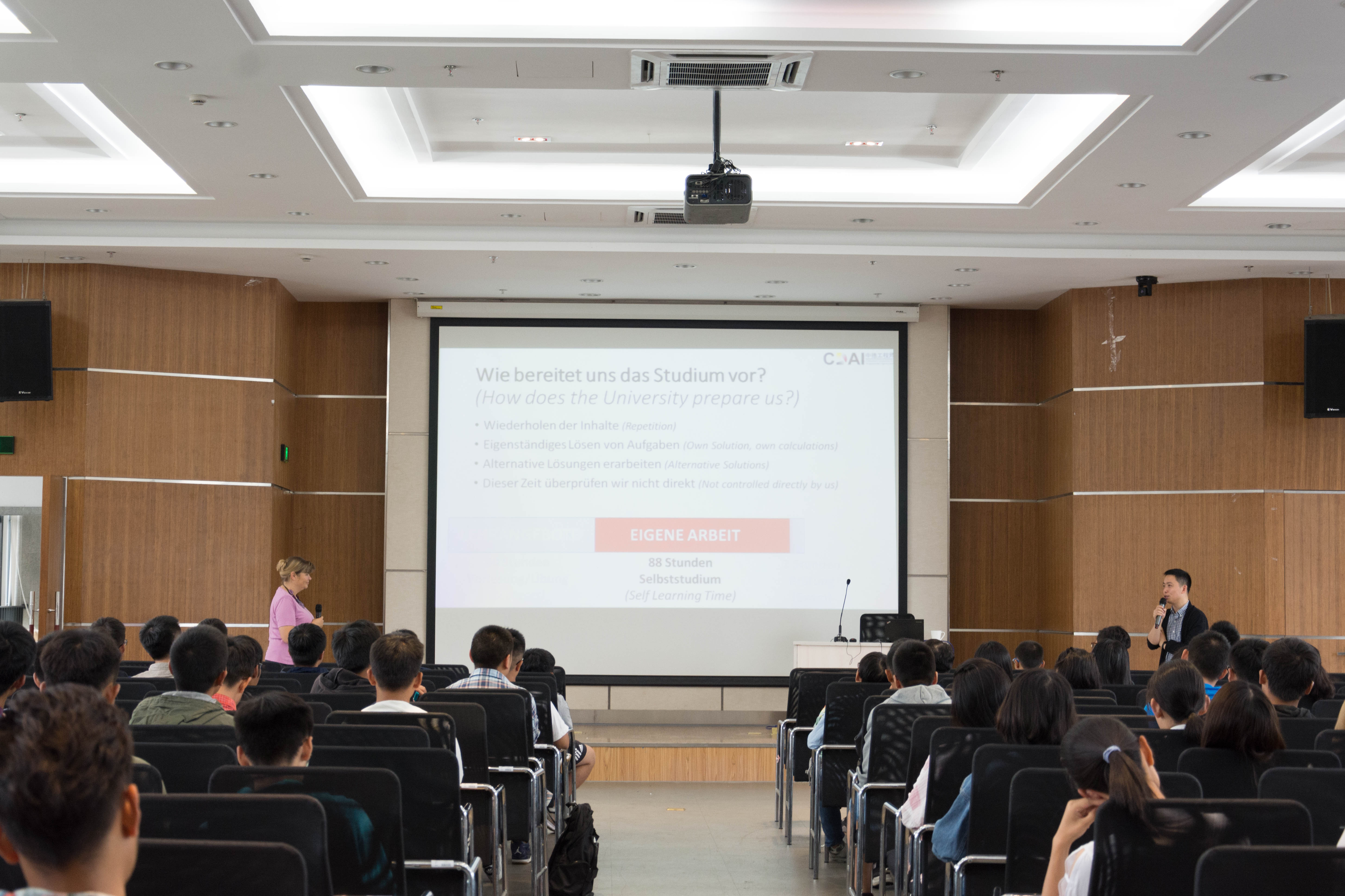 德方教师Anja Schneider女士“学生如何顺利过渡到大学生活”的主题报告,分析了新生们的迷惘与压力的来源,在充满变数的未来,建议大家学会自我调整,平衡学业、工作与生活。