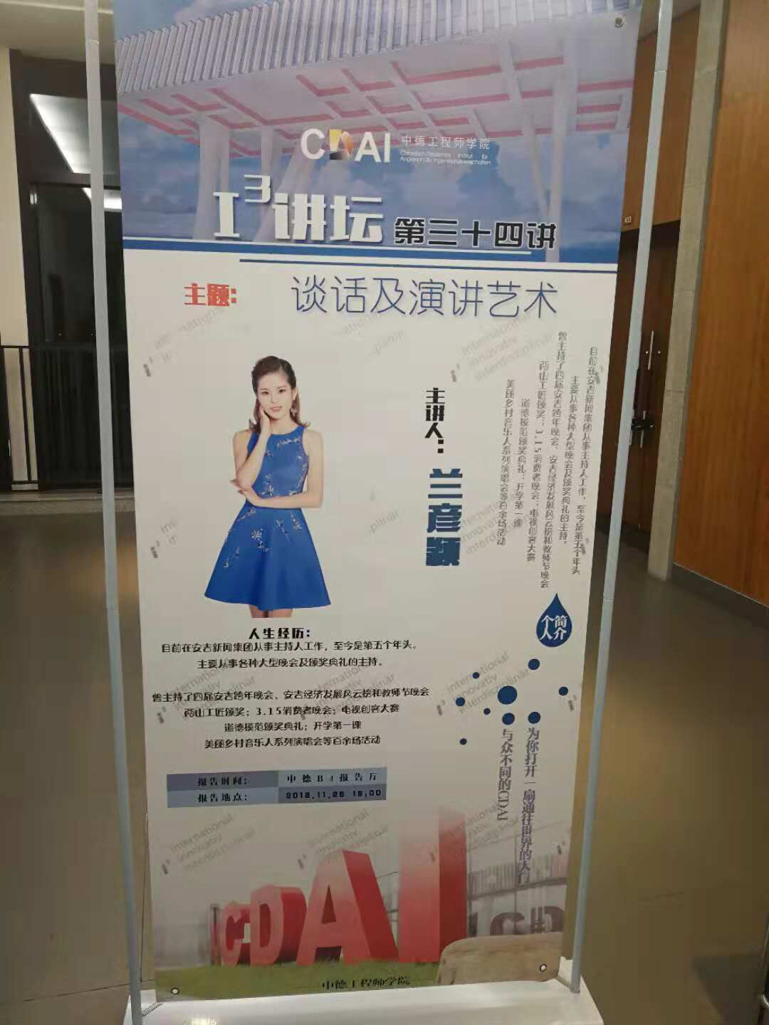 2018年11月26日18:00,快活影院 18级全体同学齐聚中德楼B4报告厅,聆听由安吉新闻集团的主持人兰彦颖带来的主题为“谈话及演讲的艺术”的I³讲坛。