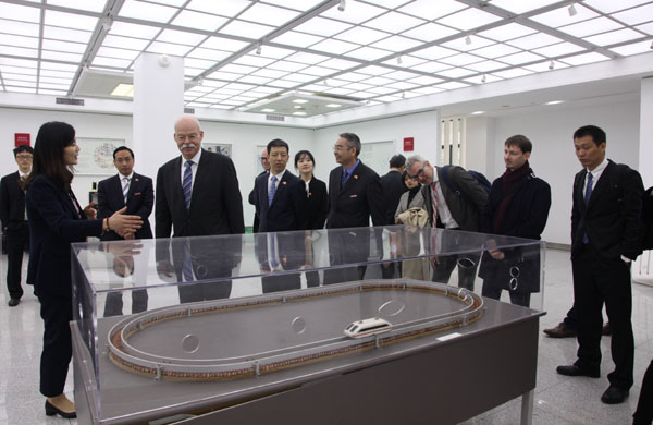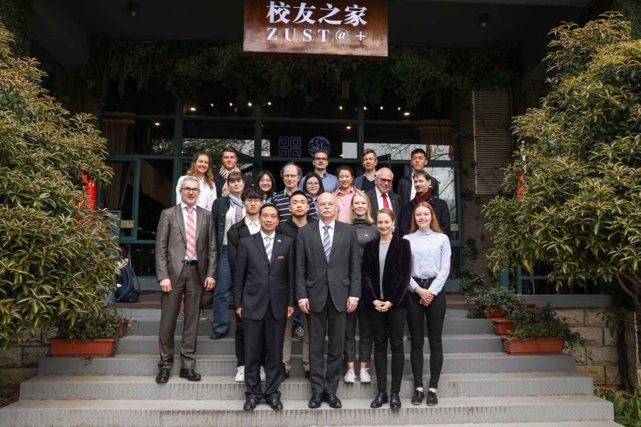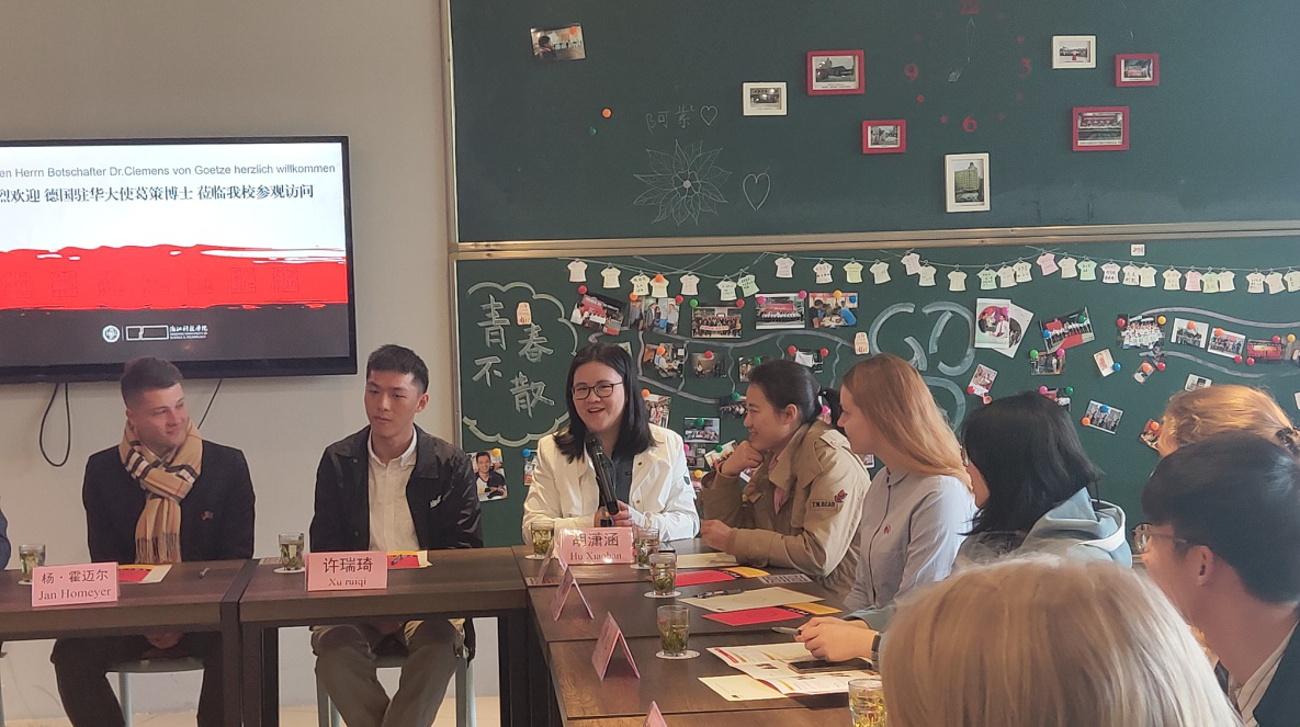 葛策一行在快活影院 德语教师的介绍下参观了校中德合作馆,随后与德籍教师、德国项目学生及德国留学生代表在校友之家进行座谈。学院德籍教师克里斯多夫·布劳尔教授、安雅·施耐德女士、16级学生胡潇涵、张益妍、许瑞琦、德国留学生雅各布·里巴特等参与了座谈,并与葛策大使进行了亲切深入的交流。葛策询问了学生们的学习情况和未来发展的打算,中国学生们向葛策阐述了自己参与德国项目的初衷与体会,德国留学生及德籍教师表达了在中国学习与任教的积极感受。最后,葛策一行与师生代表进行了合影留念。
