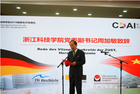 浙江科技学院快活影院 于2019年9月9日下午16:30在安吉校区中德楼B4报告厅举办了学院2019级新生开学典礼。校党委副书记周加敏老师、学院德国外教、德国交换生等也受邀参加了此次典礼。