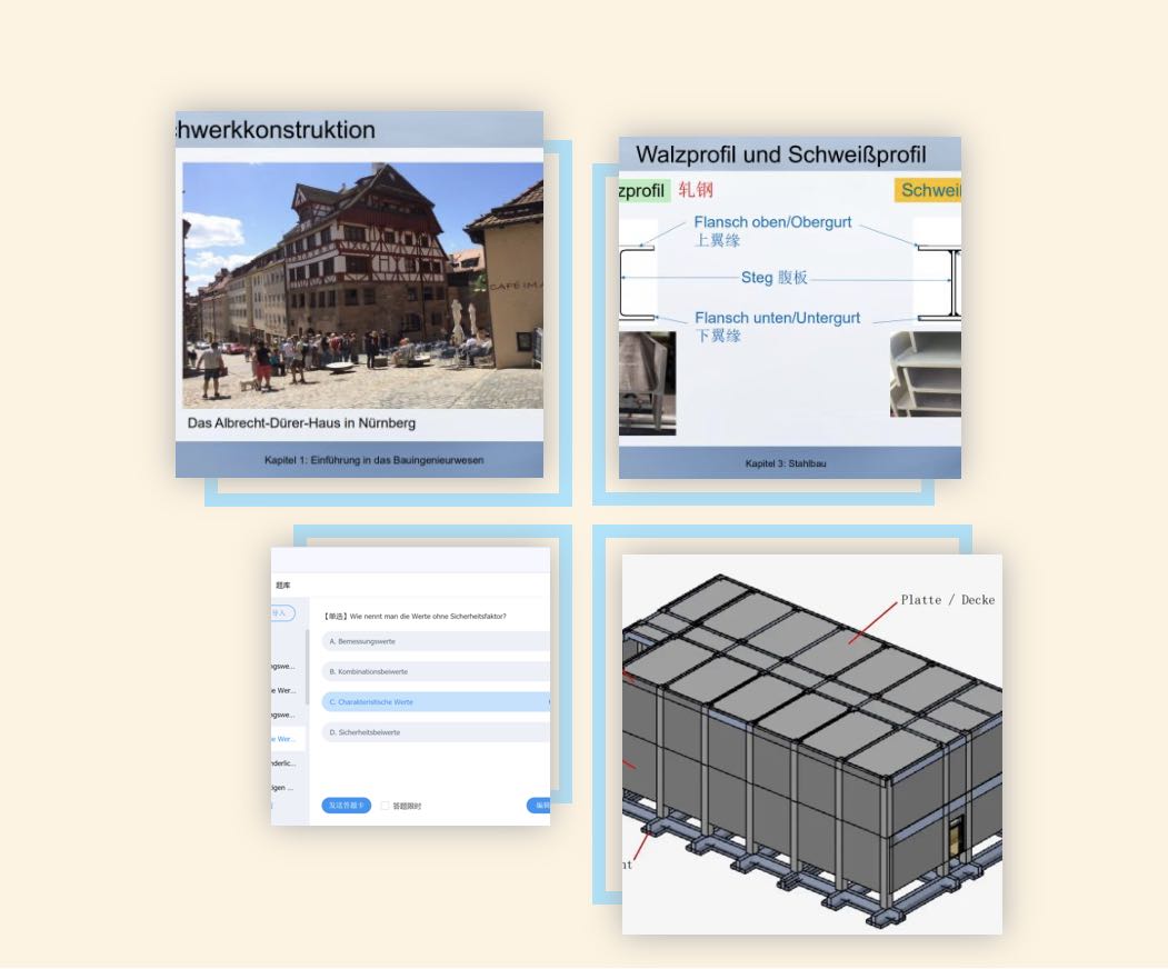 土木工程专业大二下学期与大三上学期的学生开设的必修课,教学内容整合了土木工程的各门专业课知识(专业德语I的内容侧重钢结构、混凝土结构、桥梁工程等结构课程,专业德语II的内容侧重水、施工及建筑法规等),采用中德双语授课,目的是让学生掌握土木工程专业相关德语表达,以达到能听懂德语授课的专业课及阅读德语专业文献的目的。
