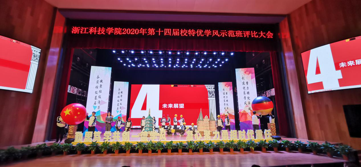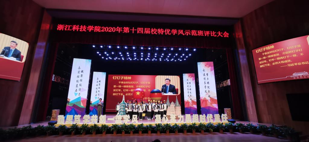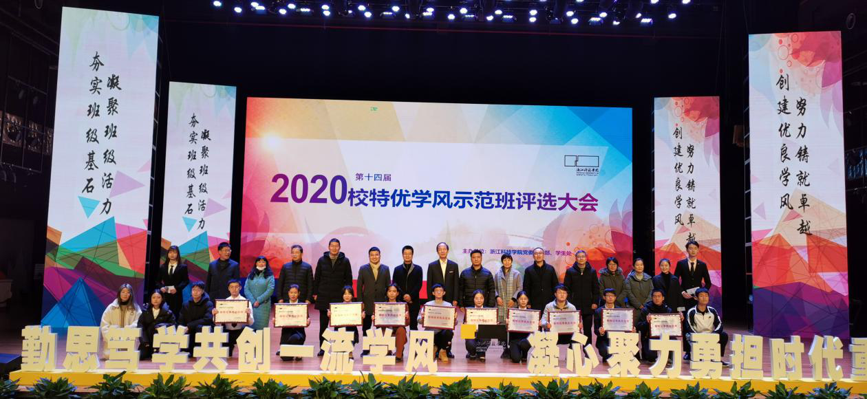 2020121418:30,浙江科技学院第十四届校特优学风示范班评选在小和山水晶剧院进行。快活影院 参评班级19土木一班经过自评、督导组听课、网络投票、现场展示等环节层层PK,最终从18个班级中脱颖而出,作为唯一大二班级荣获“校特优学风示范班”称号。