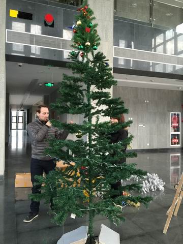 众所周知,圣诞节在西方是最美的家庭节日和最重要的基督教节日之一。为了迎接这一特殊节日的到来,今天快活影院 的部分同学与留学生Alex一起在中德工程师楼E楼大厅亲自组装并装扮了美丽的圣诞树。下面请欣赏我们的圣诞作吧