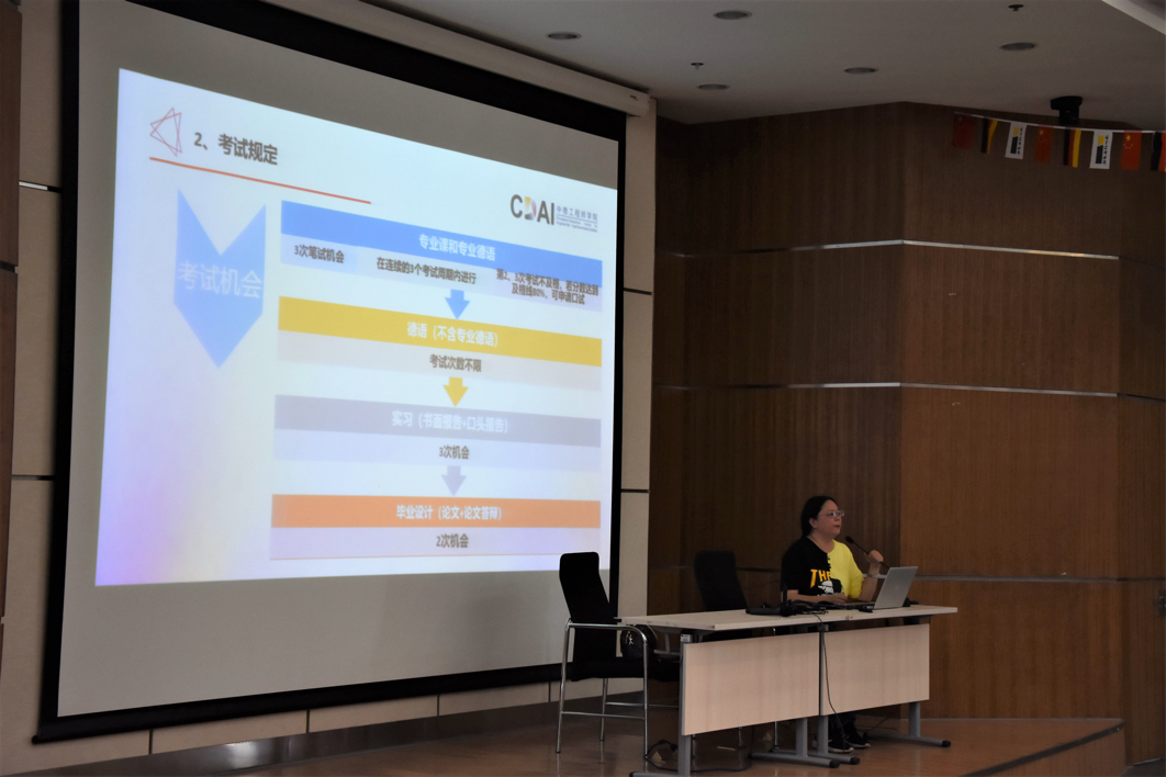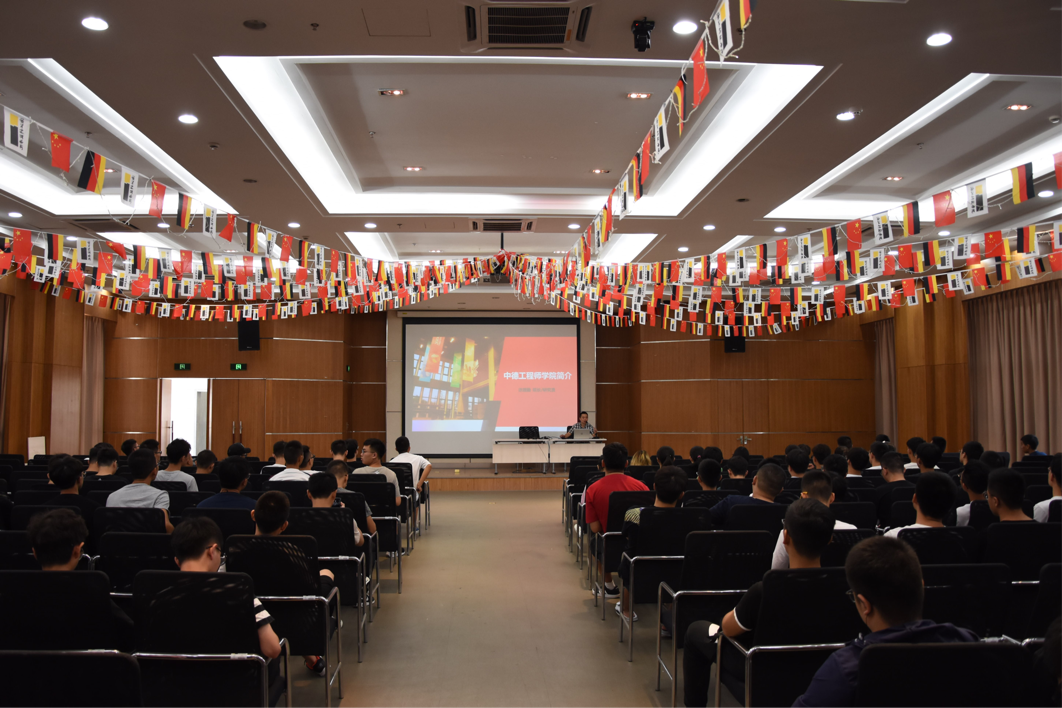 首先李成炜老师从学院独特的中德合作性质出发,从媒体关注、海内外教育资源、师资力量及德国模式的教学与管理体系几点面向2018级新生进行概况介绍,使同学们对于学院加深了认识。随后带来的学工线专题报告中,李成炜老师详细介绍了学院学生守则、生活指导、发展规划和奖学金机制四大方面,强调了学院在人才培养上的一系列帮扶举措,鼓励学生增强自律意识以及自我规划能力,珍惜大学宝贵时光。直属党支部副书记范佳静老师作为教务负责人介绍了课程设置、考试规范、出国选拔、预备实习与实习和学位指导等内容,认为在特有的考试机制下,作为中德工程学院学子,应努力完成各项任务,不应浪费每一次机会,成为更优秀的人。