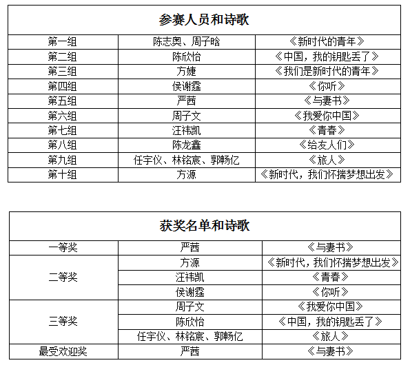 从诗歌的选取、配乐到朗读时的装扮、情绪,大家都做了精心的准备。朗诵者先后朗诵了《新时代的青年》、《中国,我的钥匙丢了》、《与妻书》等十首诗歌。台上同学们或慷慨激昂或委婉动人或荡气回肠,台下观众全神贯注,沉浸在一出出壮丽的篇章中。整场朗诵激情洋溢,感情充沛,掌声阵阵。通过现场大众的投票和评委们的打分,选出了最受欢迎奖1项,一等奖1项、二等奖三项、三等奖三项。