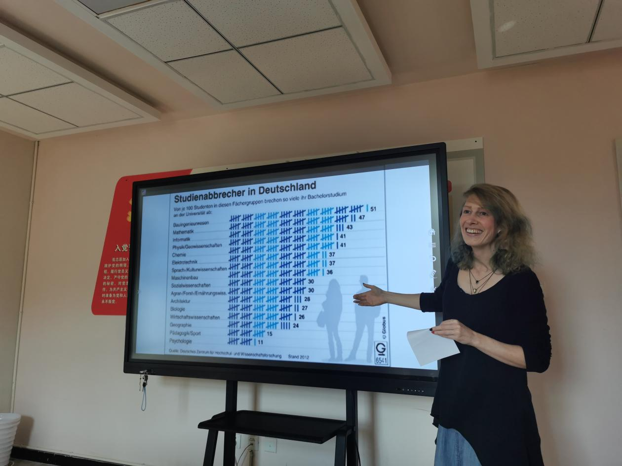 11月10月,“走向世界”辅导员工作室举办交流沙龙,我校德语教师Mara Gröner做主题分享,来自学工、教学、教务各条线教职工参加。Mara为柏林自由大学硕士,歌德学院认证德语教师,曾在德国柏林的多家语言学校任教,来华之后曾就职于成都大学,2021年起在快活影院 工作。